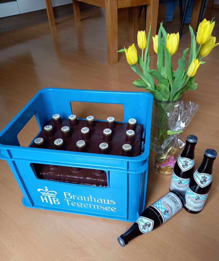 Dieser leckere sehr ergiebige Schoko-Bier-Kuchen kam getarnt als „Osterbier“ sehr gut an. Eine witzige Idee die allerdings ein bisschen Vorbereitung braucht wenn man nicht die sauber geöffneten Kronkorken und einen leeren Bierkasten sofort zuhause hat.