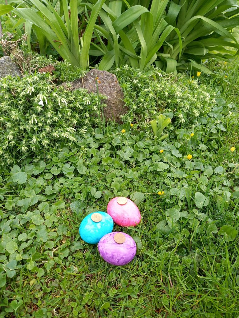 Man braucht dazu zwei Latten, die als schiefe Ebene (Bahn) aufgestellt werden können. Jeder Mitspieler hält nun 3 Eier der gleichen Farbe, und ein paar Münzen bereit, dann kann es auch schon losgehen. Auf der Bahn rollt man nun die Eier abwechselnd herunter und legt jeweils ein Centstück darauf. Ziel des Spiels ist es, möglichst viele Eier der Gegner so an zu stupsen, dass das Geld runter fällt. Wer getroffen hat darf den Cent behalten und der Eibesitzer muss nachlegen. Gewonnen hat am Ende der jenige, mit den meisten Münzen.