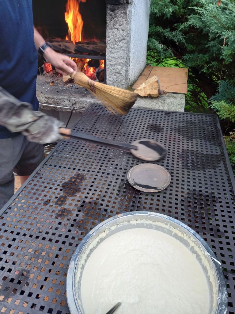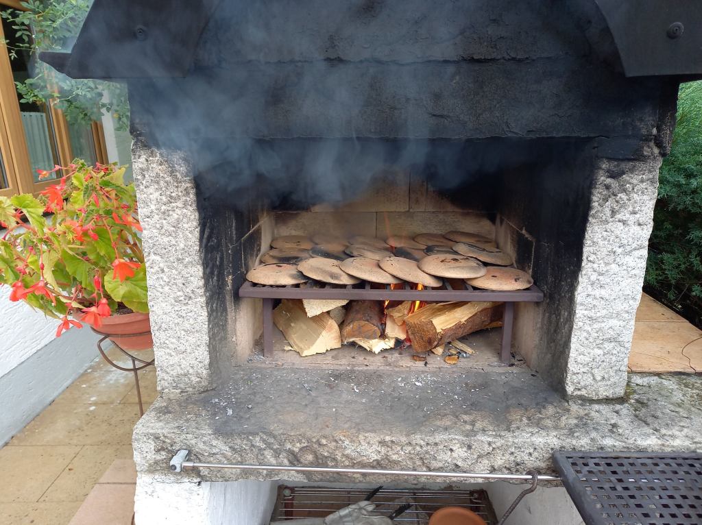 Bei richtiger Temperatur ( was garnicht so einfach und eindeutig Übungssache ist) werden dann die Tonschalen mit Teig bestrichen und übereinander gestapelt. Durch die Hitze der darüberliegenden Tonschale wird der Fladen gebacken. So fährt man nun fort bis ein Türmchen entsteht.