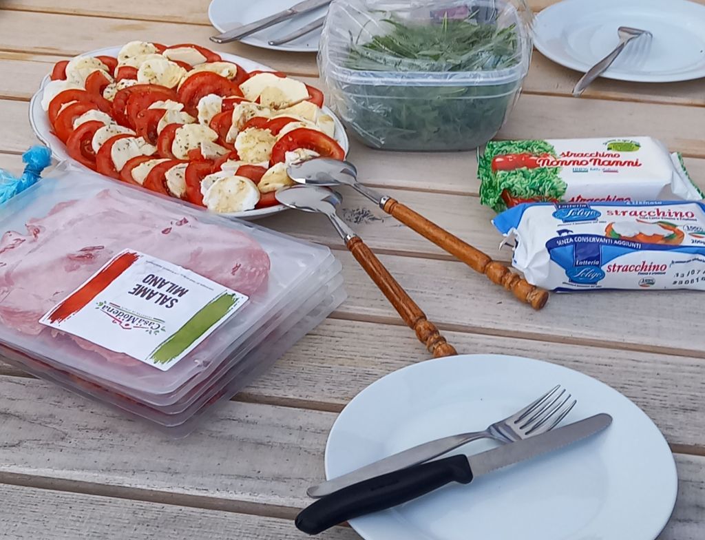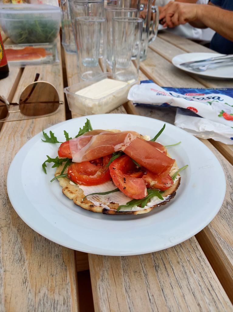Als ich die Terasse betrat weckte das Feuer im Ofen sofort meine Lust am Grillen. Die gedeckte Tafel aber lies erahnen dass es sich hier doch um eine gemütliche Brotzeit im Kreis von Freunden oder Familie handelt. Der Tisch stand bereit mit Salami, Serrano Schinken, Ruccola, Tomaten und Stracchino Käse. Je nach Wunsch können die Panigacci auch süß belegt oder mit Nutella bestrichen werden.